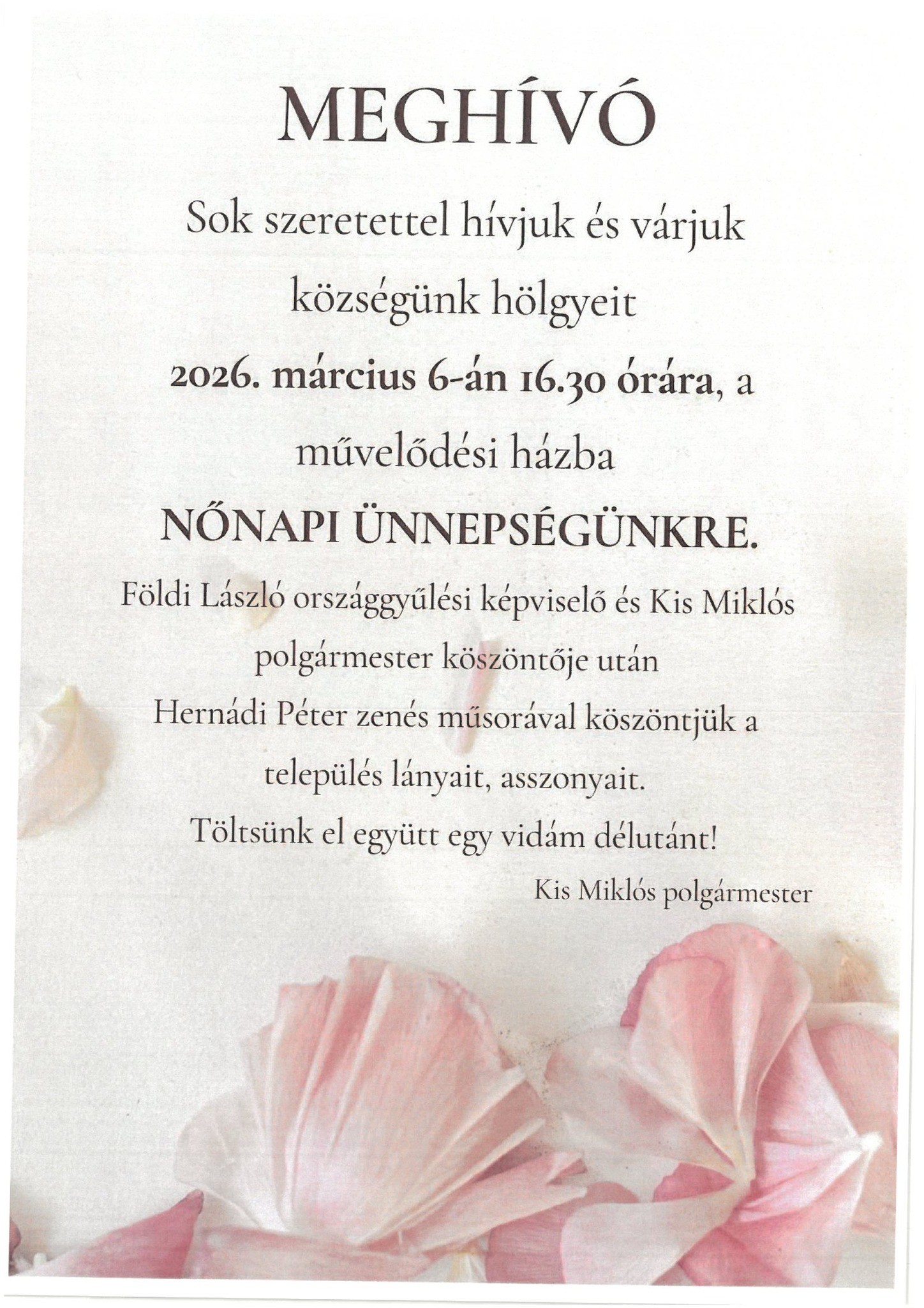 Sok szeretettel hívjuk és várjuk településünk hölgyeit 2026. március 6-án (péntek) 16:30 órára a művelődési házba egy közös, vidám ünneplésre!