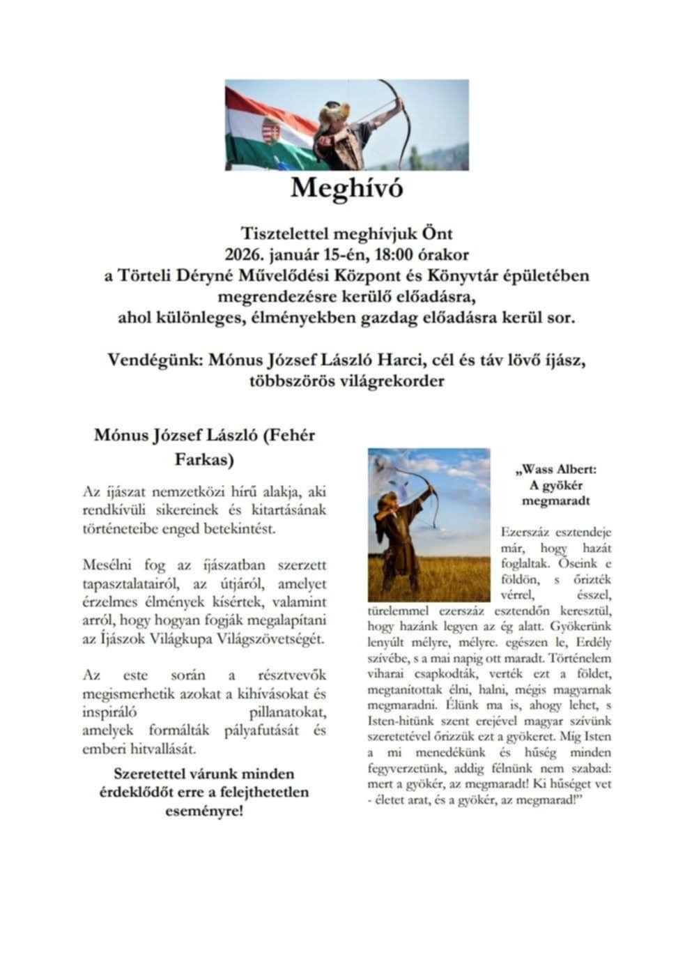 Az eseményt Wass Albert „A gyökér megmaradt” című gondolatai is átszövik, hangsúlyt adva a magyarság, az értékek és a hagyományok megőrzésének. Inspiráló, elgondolkodtató est vár minden érdeklődőt.
