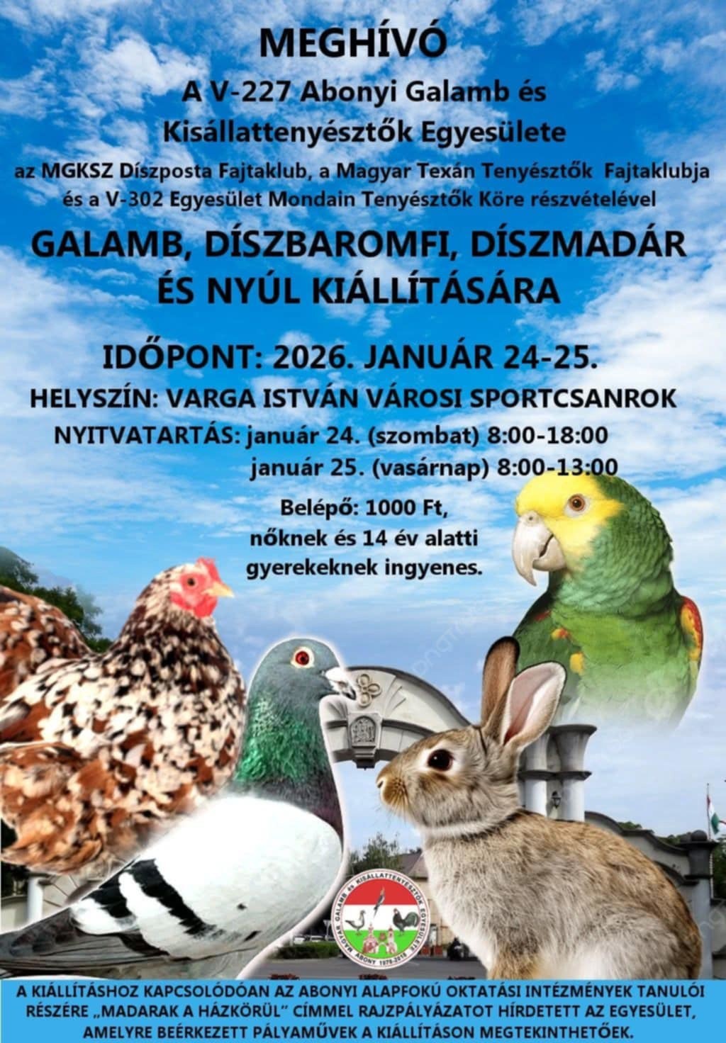 január 24–25-én különleges élmény várja az állatbarátokat Abonyban, a Varga István Városi Sportcsarnokban, ahol megrendezésre kerül a galamb-, díszbaromfi-, díszmadár- és nyúlkiállítás. A rendezvény házigazdája a V-227 Abonyi Galamb- és Kisállattenyésztők Egyesülete, több fajtaklub és tenyésztői kör közreműködésével.